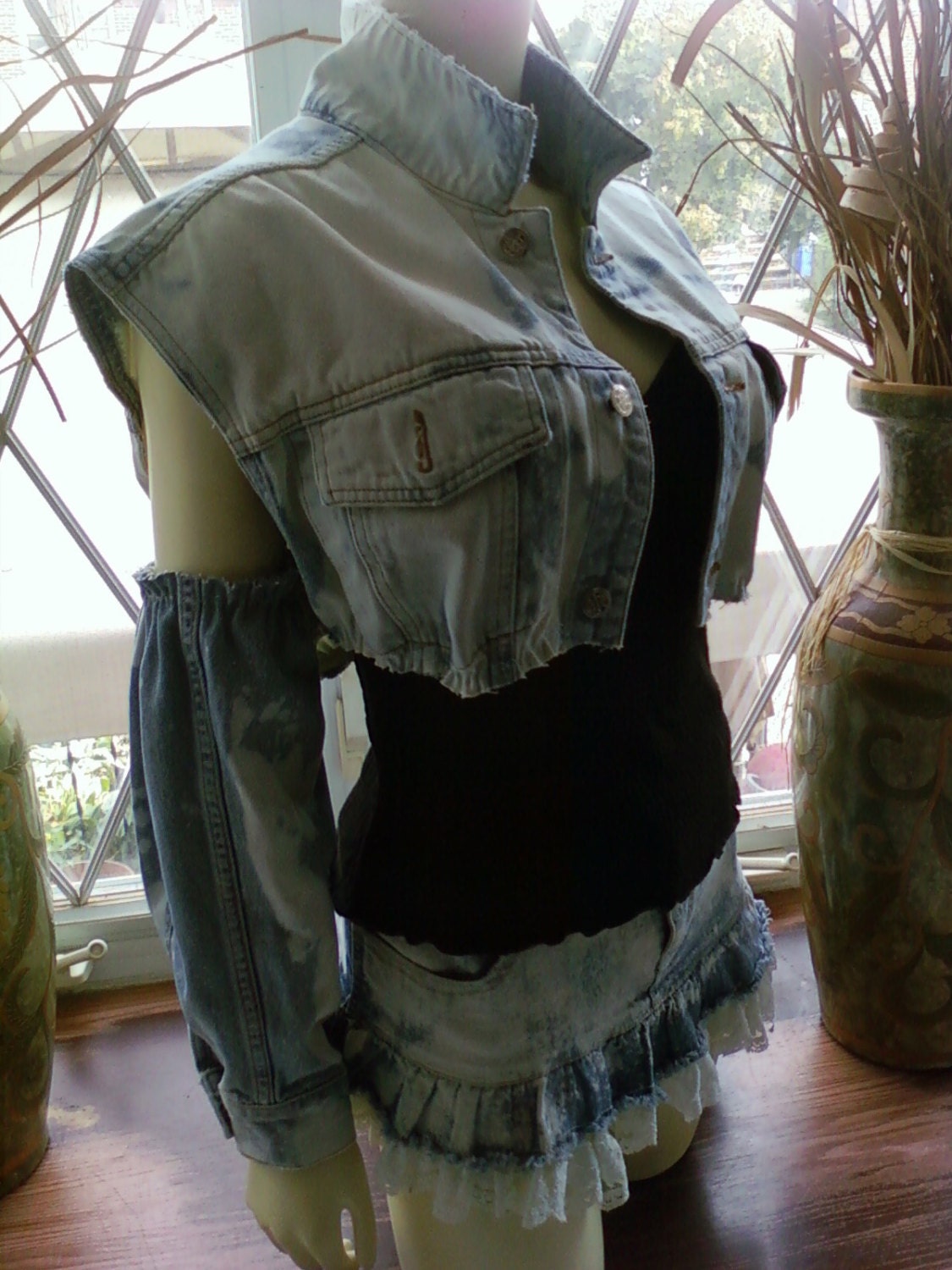 Unique Cut Faded Denim Jean Jacket with Detached Sleeves are the only Item for sale in this photo. Other Clothing in Photos are Not for Sale. The Skirt, the Black Hoody, and the Black Top/Shirt is NOT for SALE!!!! So when you bid on this listing and you win you will be only receiving the Unique Cut Faded Denim Jean Jacket with Detached Sleeves.